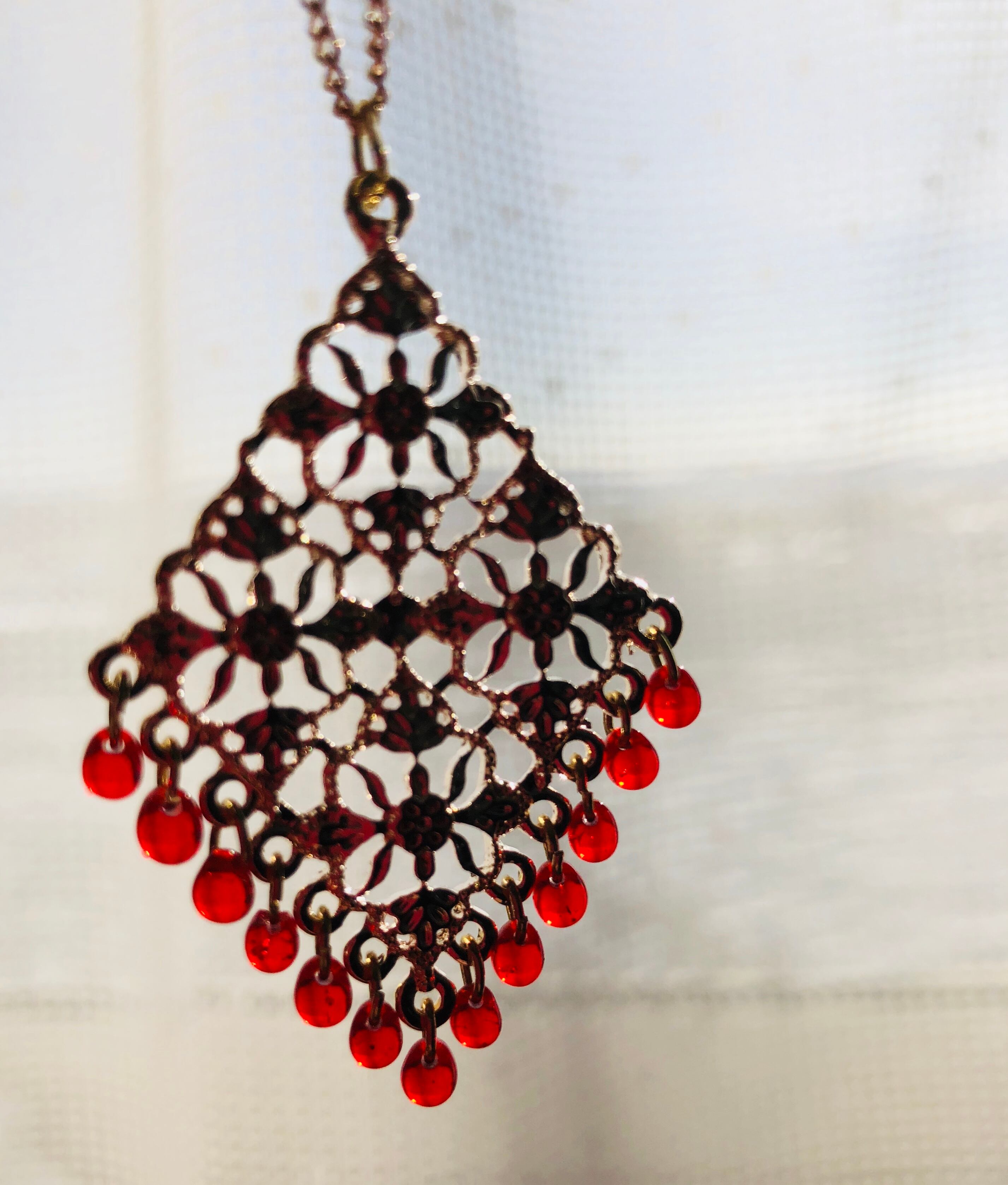 キラキラ輝く赤の雫ビーズを、ゴールドの透かしパーツにつけました。