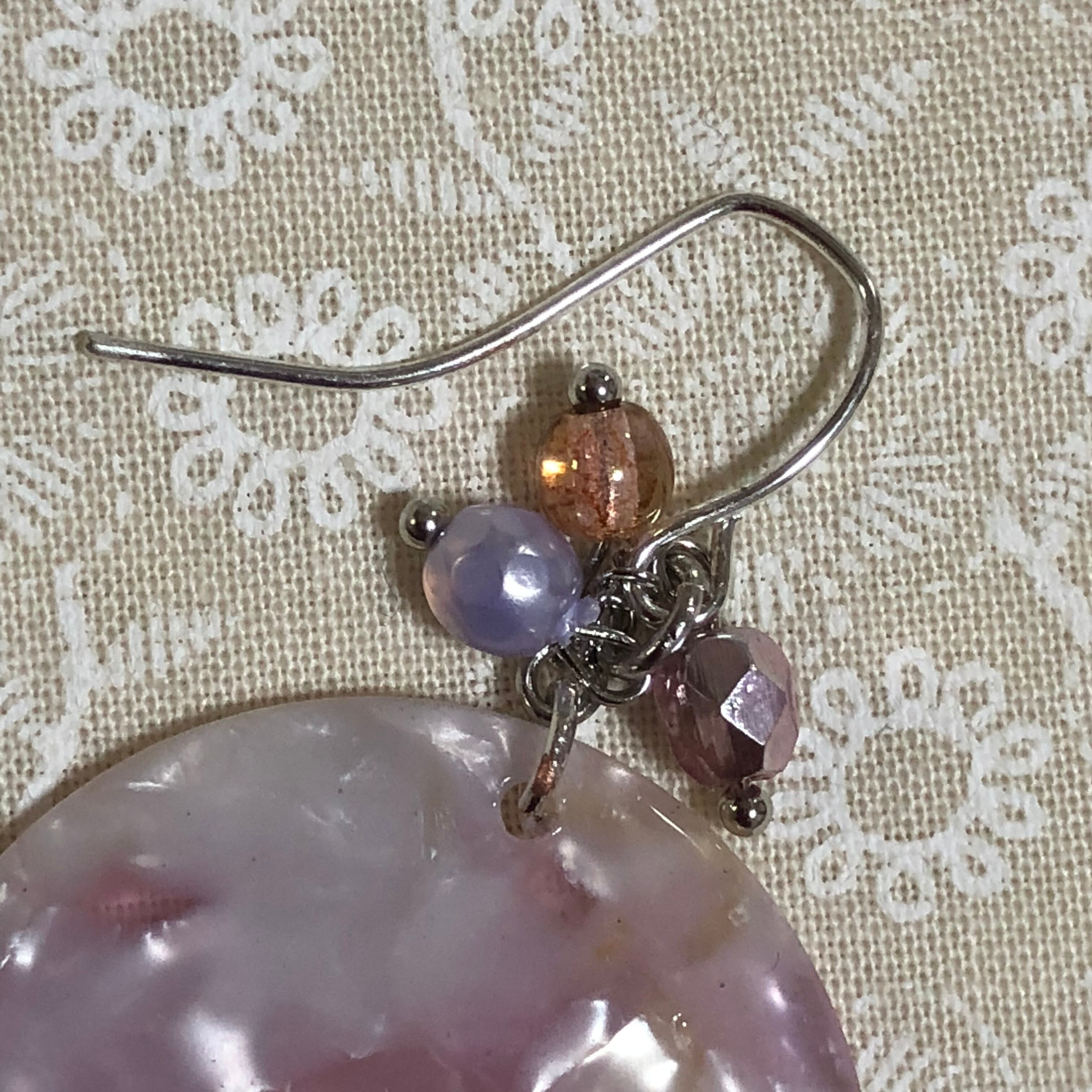 直径2.2㎝のマーブルピンクのラウンドプレートとライラックパールビーズ4㎜、ピンクラスターのチェコムースラウンドビーズ 4㎜、ライトローズのハーフキャル4㎜を使いました。